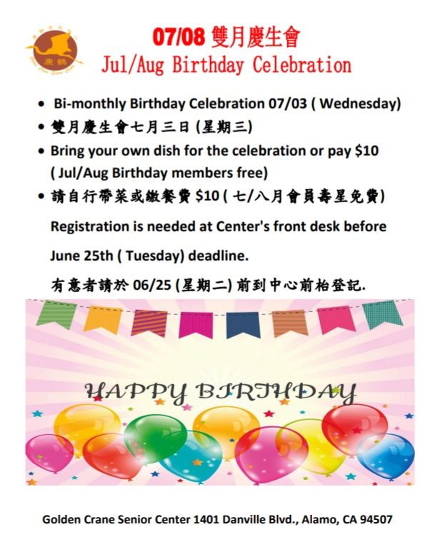 Golden Crane Senior Center – 635 Old Orchard Drive, Danville, CA 94526 (925)-718-6222.
