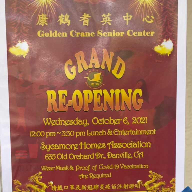 Golden Crane Senior Center – 635 Old Orchard Drive, Danville, CA 94526 (925)-718-6222.